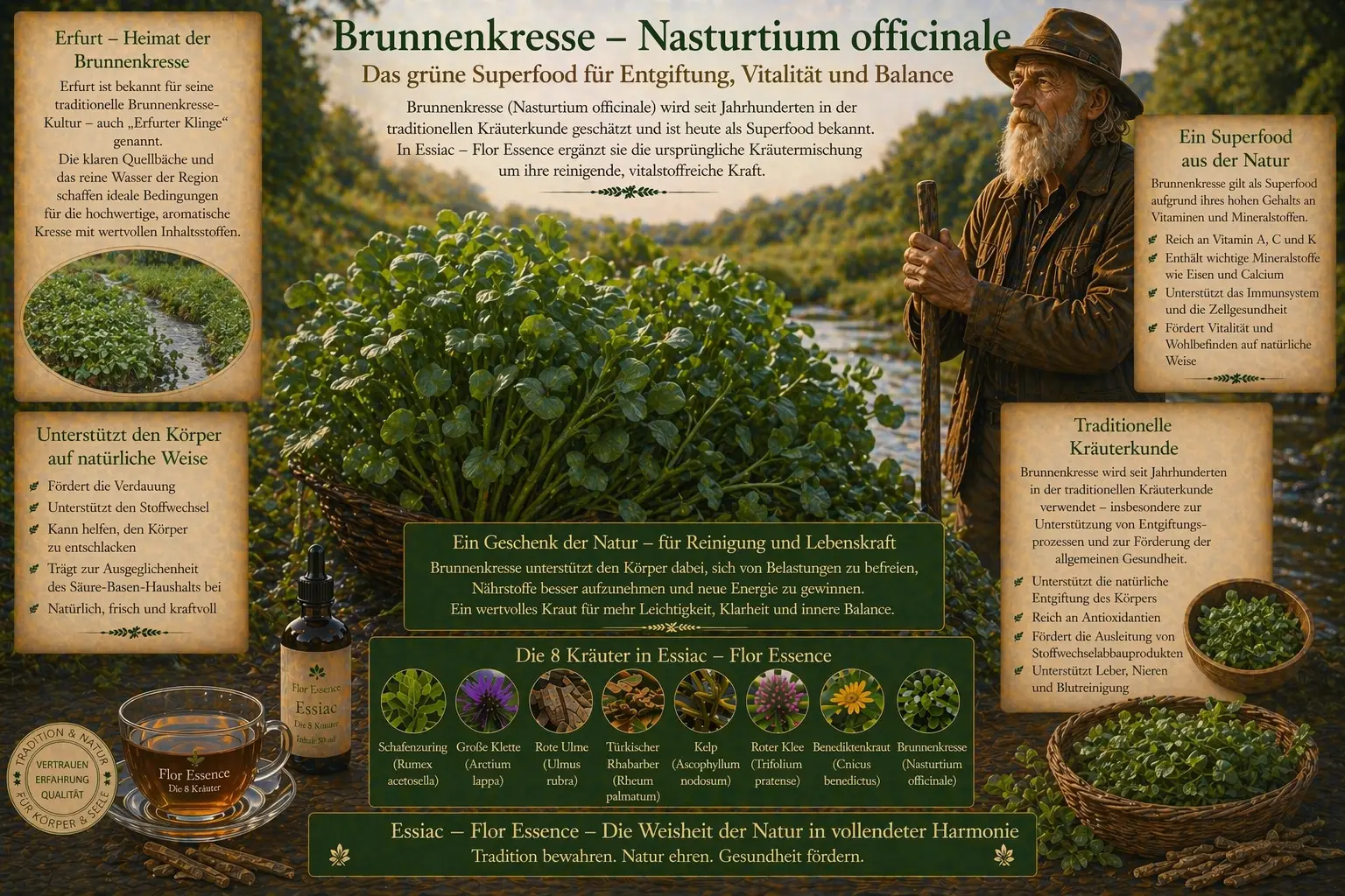 Der Überlieferung nach sahen René Caisse und später auch Dr. Charles Brusch die Stärke von Essiac gerade in der Kombination verschiedener Kräuter. Jedes Kraut hat seine eigene Rolle innerhalb der Formel. Brunnenkresse wurde geschätzt, weil sie zusätzliche Nährstoffe liefert und so zur Synergie der gesamten Essiac-Kräutermischung beiträgt.